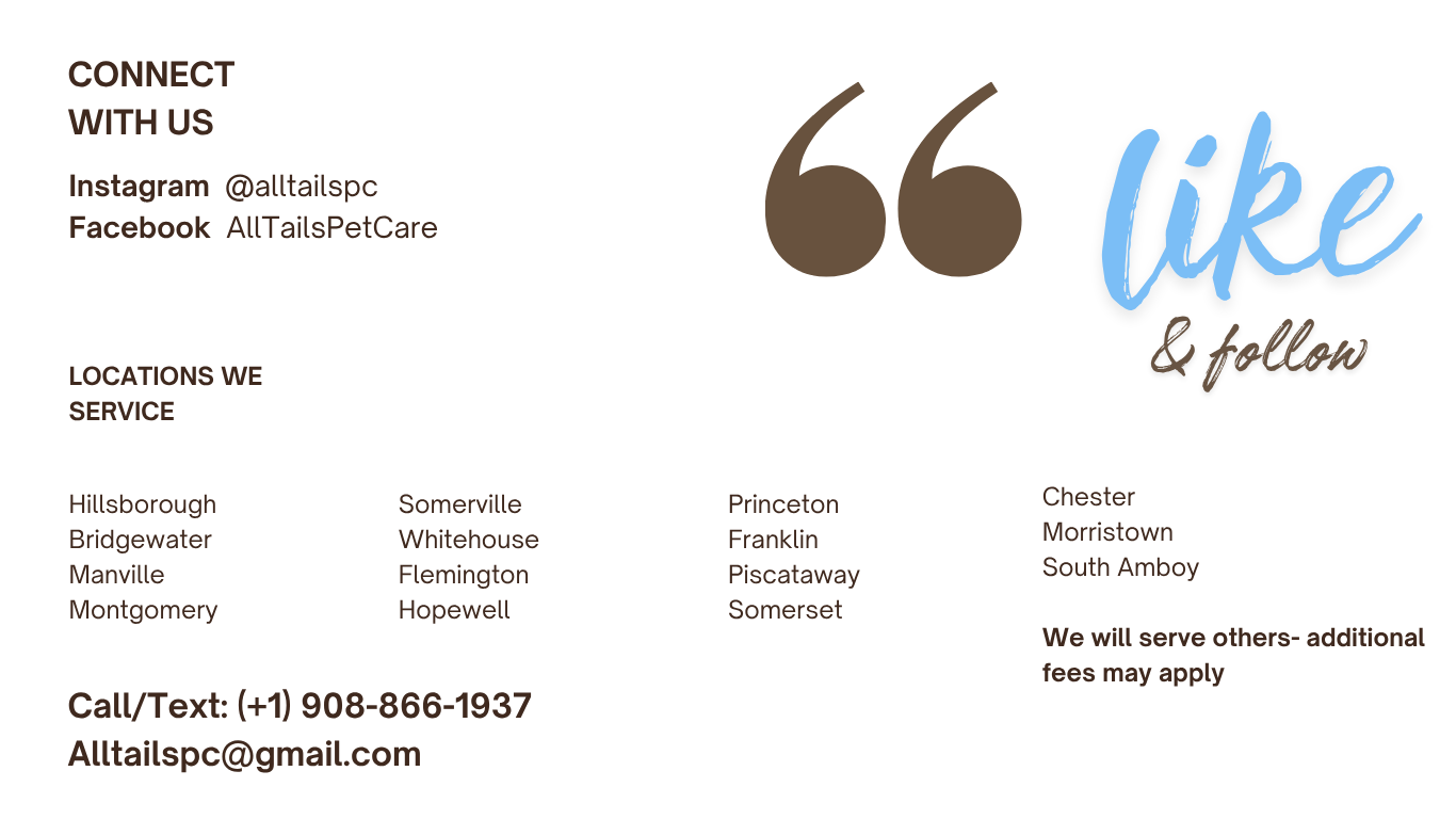 All Tails Pet Care was built on a simple idea: pets deserve consistent, thoughtful care when their people can’t be home. We provide professional pet sitting services throughout New Jersey, offering dependable support for busy schedules, travel, and unexpected changes. Every pet has its own routine, habits, and personality — we take the time to understand each one individually so their day stays as normal and stress-free as possible. Our background includes hands-on experience with a wide range of animals, from dogs and cats to small livestock. We focus on practical, attentive care, clear communication with owners, and maintaining a safe environment for every pet we’re trusted to look after.