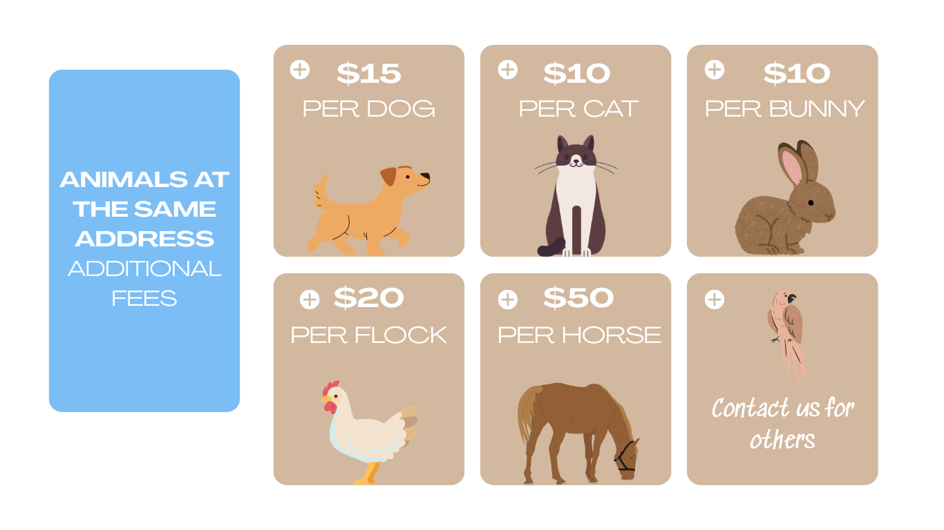 Rabbits/Bunnies at the same address as another pet will add a fee of $10 per bunny/per visit for care services.